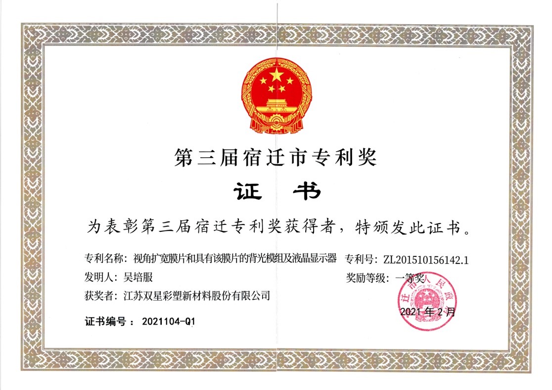 2021年5月7日,全市加快工業(yè)經(jīng)濟高質(zhì)量發(fā)展暨招商引資大會上,表彰了第三屆宿遷市專利獎獲獎單位,公司申報的“視角擴寬膜片和具有該膜片的背光模組及液晶顯示器”專利項目榮獲一等獎。