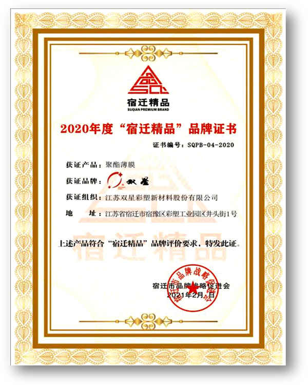 近日,從宿遷市市場(chǎng)監(jiān)督管理局、宿遷市品牌戰(zhàn)略促進(jìn)會(huì)公布的2020年度“宿遷精品”品牌獲證企業(yè)名單中獲知,江蘇雙星彩塑新材料股份有限公司“雙星”牌聚酯薄膜獲品牌認(rèn)證殊榮。