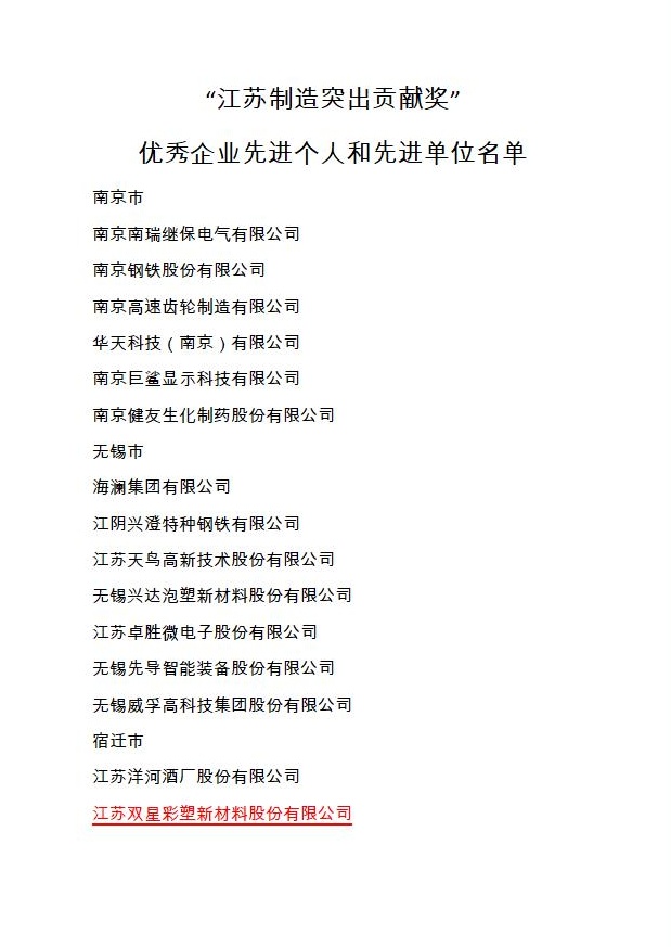 近日,中共江蘇省委、江蘇省人民政府發(fā)文表彰“江蘇制造突出貢獻獎”優(yōu)秀企業(yè)、先進個人和先進單位,全省共有50家企業(yè)被評為優(yōu)秀企業(yè)、48人被評為先進個人、50家單位被評為先進單位,江蘇雙星彩塑新材料股份有限公司入選“江蘇制造突出貢獻獎”優(yōu)秀企業(yè)榜單。
