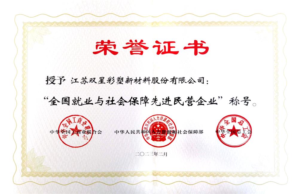 新征程勇?lián)敚瑸檫M一步發(fā)揮民營企業(yè)在促進就業(yè)、改善民生方面的積極作用,持續(xù)優(yōu)化創(chuàng)建和諧勞動關系。經全國工商聯(lián)、人力資源社會保障部、全國總工會決定,授予雙星新材“全國就業(yè)與社會保障先進民營企業(yè)”榮譽稱號,2月21日,在江蘇省工商聯(lián)一樓分會場舉行頒獎儀式,以表彰企業(yè)在就業(yè)和社會保障方面作出的突出貢獻。