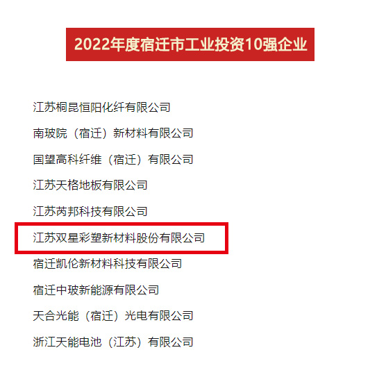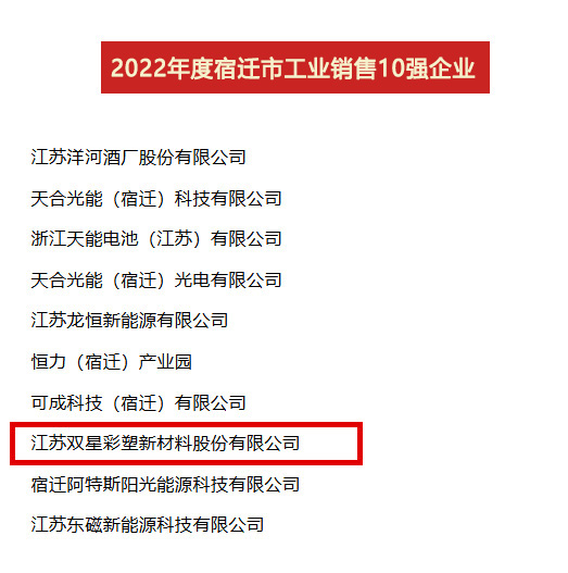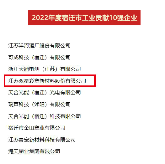 2023年4月7日,全市開發(fā)區(qū)高質(zhì)量發(fā)展暨工業(yè)經(jīng)濟(jì)年度表彰大會(huì)召開,公布了2022年度“宿遷市工業(yè)貢獻(xiàn)10強(qiáng)、工業(yè)投資10強(qiáng)、工業(yè)銷售10強(qiáng)”名單,雙星新材喜獲“貢獻(xiàn)10強(qiáng)位列第4位、投資10強(qiáng)位列第6位、銷售10強(qiáng)位列第8位”。