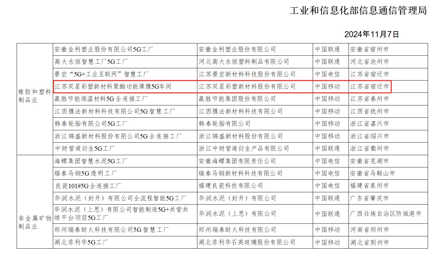 近日,工業(yè)和信息化部發(fā)布了關(guān)于《2024年5G工廠名錄》的公示,江蘇雙星彩塑新材料股份有限公司成功入選。