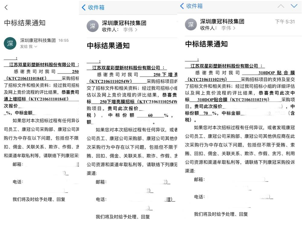 2021年6月11日我公司參加深圳康冠科技集團招標會,公司三款光學膜片產(chǎn)品:250下增亮膜、250上增亮膜和310DOP貼合膜喜獲中標。此次中標的各款產(chǎn)品分別獲得康冠科技該款產(chǎn)品60%-70%市場需求份額,為推進公司光學膜片發(fā)展和“99.666工程起到積極作用。