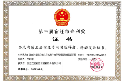 2021年5月7日,全市加快工業(yè)經(jīng)濟(jì)高質(zhì)量發(fā)展暨招商引資大會上,表彰了第三屆宿遷市專利獎獲獎單位,公司申報的“視角擴(kuò)寬膜片和具有該膜片的背光模組及液晶顯示器”專利項目榮獲一等獎。
