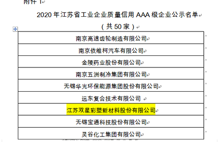 日前,從江蘇省市場(chǎng)監(jiān)督管理局公布的2020年度江蘇省工業(yè)企業(yè)質(zhì)量信用等級(jí)AA、AAA級(jí)企業(yè)名單中獲悉,江蘇雙星彩塑新材料股份有限公司被授予“江蘇省質(zhì)量信用AAA級(jí)企業(yè)”。 江蘇省工業(yè)企業(yè)信用等級(jí)評(píng)價(jià)是江蘇省政府推進(jìn)誠(chéng)信江蘇建設(shè)的重要組成部分,由省、市、區(qū)三級(jí)質(zhì)量技術(shù)監(jiān)督和信用管理部門(mén)共同組織開(kāi)展。 雙星新材早在2018年已通過(guò)了信用等級(jí)AA級(jí)評(píng)審。在此基礎(chǔ)上公司根據(jù)《江蘇省企業(yè)質(zhì)量信用評(píng)價(jià)管理辦法》的規(guī)定,積極組織相關(guān)部門(mén)準(zhǔn)備申報(bào)材料,經(jīng)過(guò)江蘇省、宿遷市以及開(kāi)發(fā)區(qū)質(zhì)監(jiān)局領(lǐng)導(dǎo)組成的省質(zhì)量信用核查組