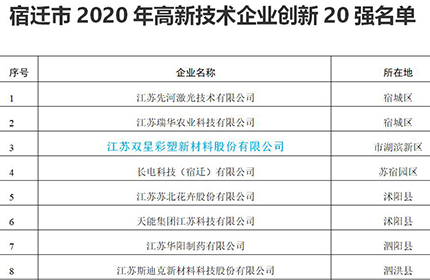 近日經(jīng)專家審核以及一系列嚴(yán)格的評(píng)選流程,雙星新材憑借領(lǐng)先的技術(shù)實(shí)力、突出的產(chǎn)品優(yōu)勢(shì)和企業(yè)成長(zhǎng)潛力,成功入選“2020宿遷高新技術(shù)企業(yè)20強(qiáng)”企業(yè),這是雙星新材2020年度榮獲的又一含金量十足的企業(yè)榮譽(yù)。