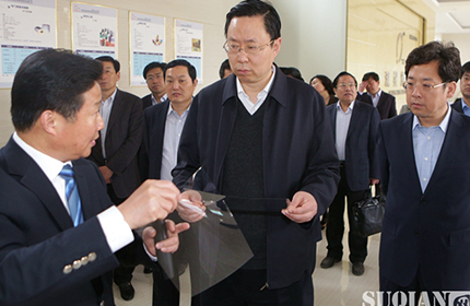 2015年12月5日下午,江蘇省副省長,代理省長石泰峰在宿遷市市長王天琦、市委書記魏國強 副市長、湖濱新區(qū)黨工委書記李榮錦等陪同下,蒞臨雙星新材參觀指導工作。雙星新材董事長吳培服熱情接待石泰峰一行,陪同參觀了公司的產(chǎn)品展廳,并實地前往生產(chǎn)車間視察。